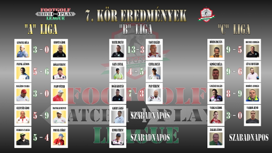 A téli időjárási körülmények miatt elhúzódott a Footgolf Match Play League első kiírásának hetedik fordulója. A három osztályban először Bogár Krisztián végzett biztos feljutó helyen, míg a Varró Jenő harmadik ki nem állása a kizárást vonta maga után.